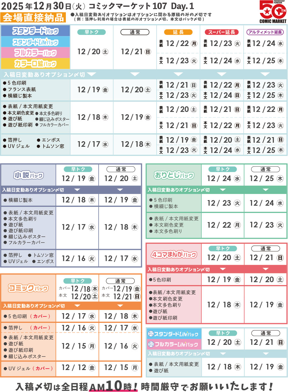 ● 『コミックマーケット107』直接会場搬入専用の〆切表となります。
